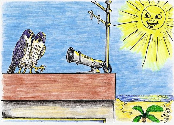 Sjef en ik keken via onze verrekijkers naar de valken op de dakrand.