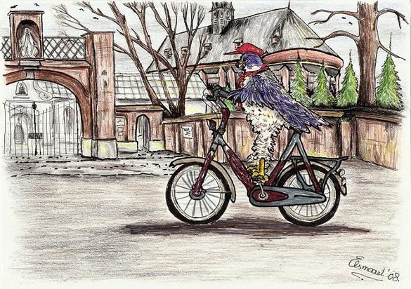 De beste houding van mij was om te doen alsof het de normaalste gang van zaken was te lopen in gezelschap van een aangeklede slechtvalk! En toch, ik kon nauwelijks een lach onderdrukken toen de fietser gehaast overeind krabbelde en het op een lopen zette met de fiets aan de hand, met het nodige gegil.