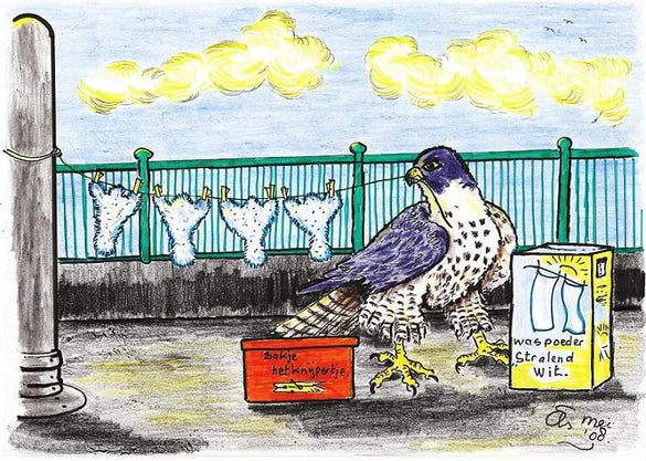 Daar liep ik dan. Wie had ooit kunnen denken dat ik over de Hemels-bleekweg zou lopen met een slechtvalk aan mijn zijde die een pet droeg en een zakdoek als sjaal om geknoopt had van Sjef! Telkens moest ik vol ongeloof naar Pa kijken. Daarnaast had ik nog niet eerder het geluk gehad de valken van zo nabij zo goed te kunnen bekijken. Mijn bewondering was al zo groot voor deze vogels, maar mijn bewondering werd nu alleen maar groter! Wat is een slechtvalk een schitterende roofvogel. Wat een sterk karakter bezaten zij!