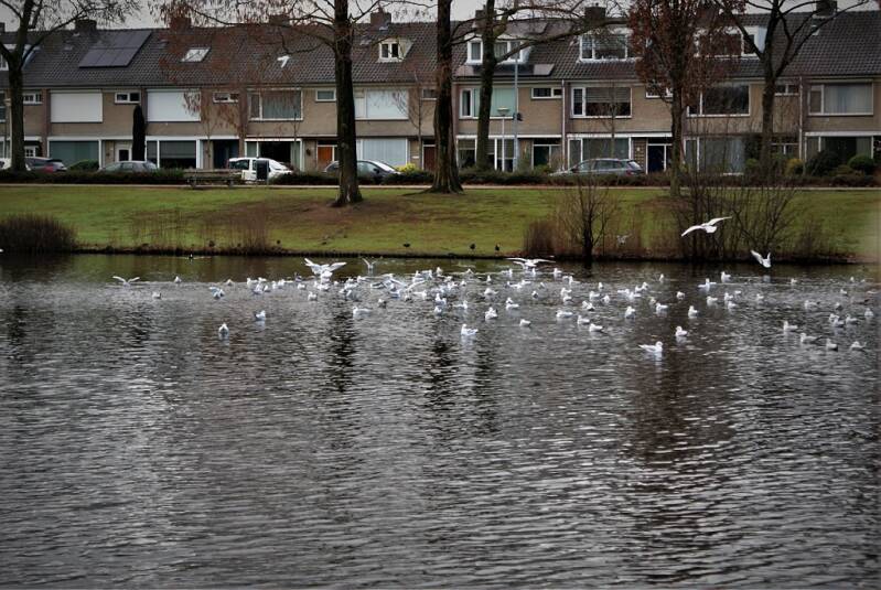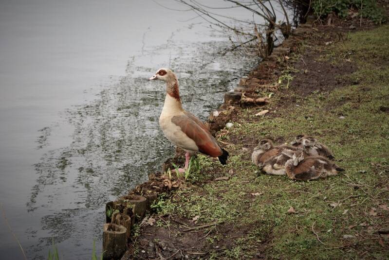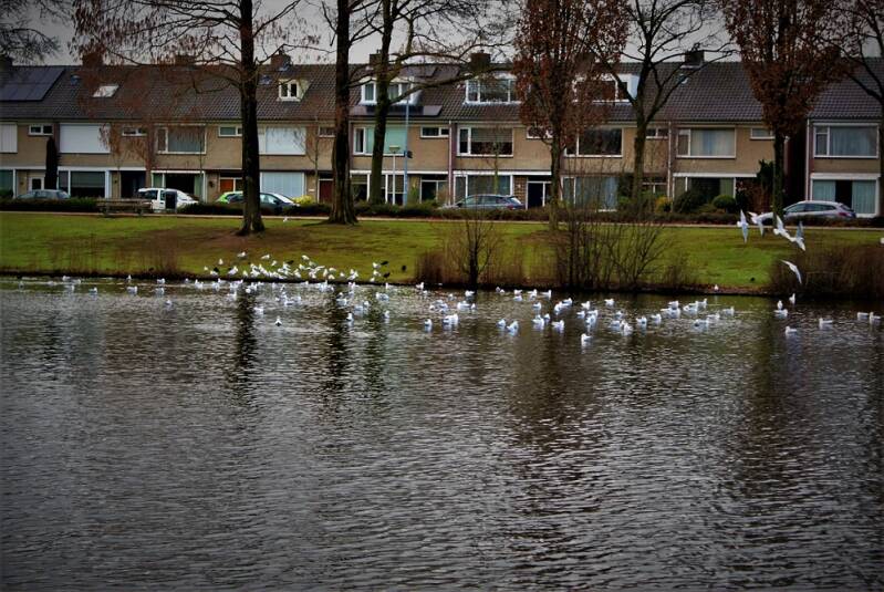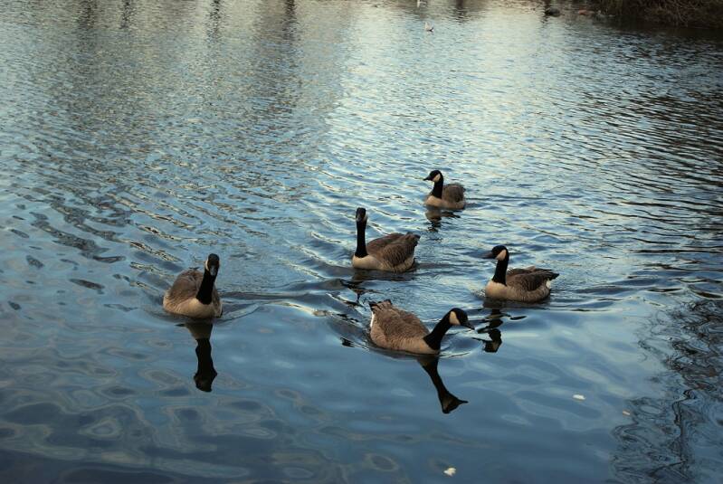 Op de grote waterpartij de wilde eenden, meerkoeten, de Canadese