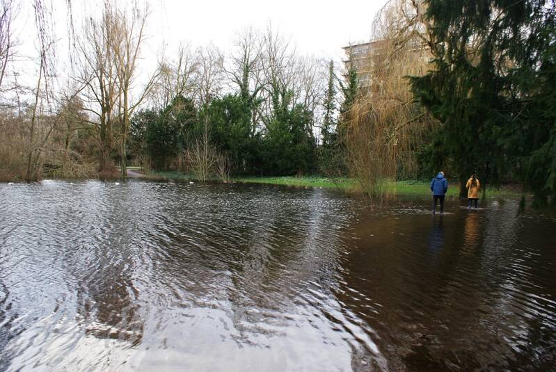 Bij de kleine waterpartij. Geheel overstroomd: het pad en de grasranden.