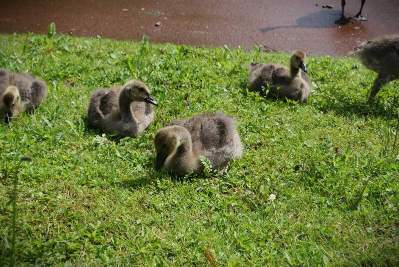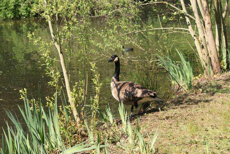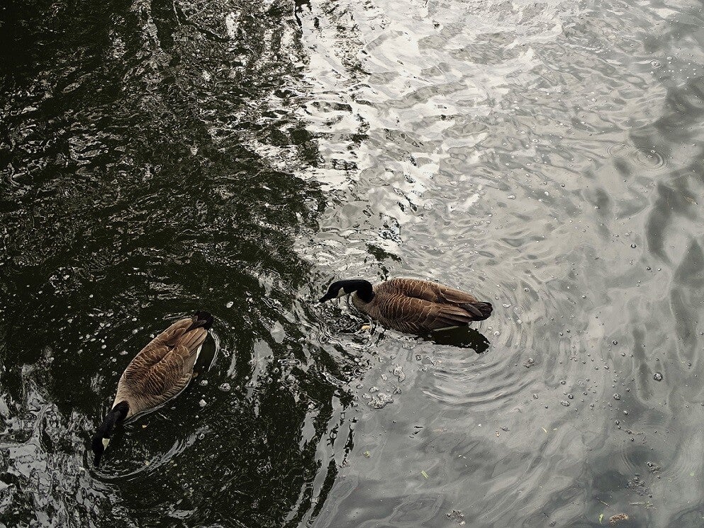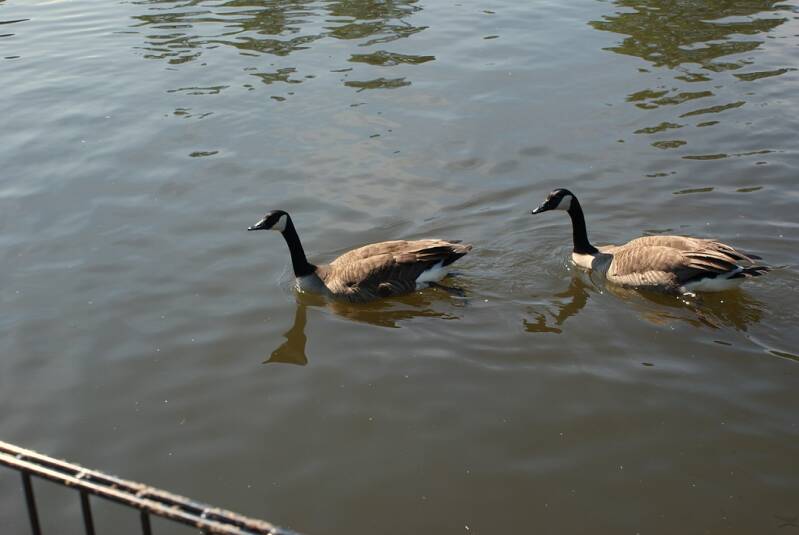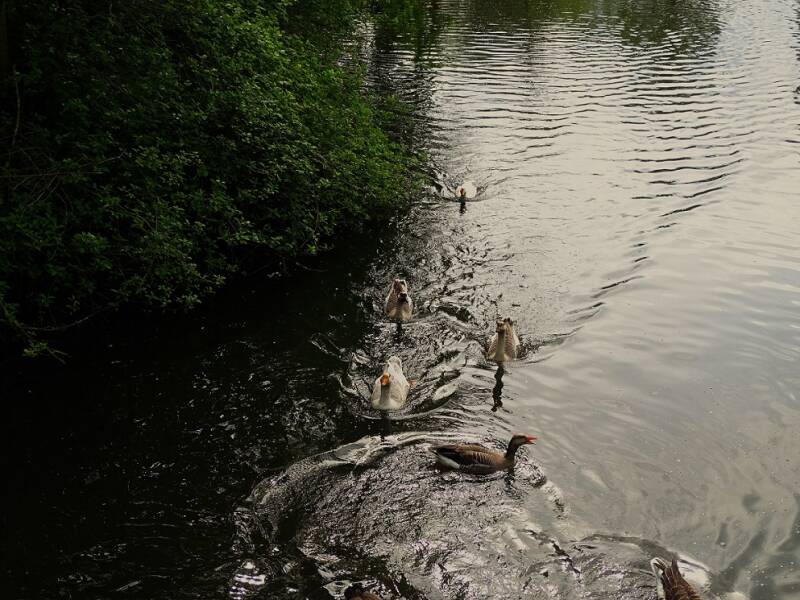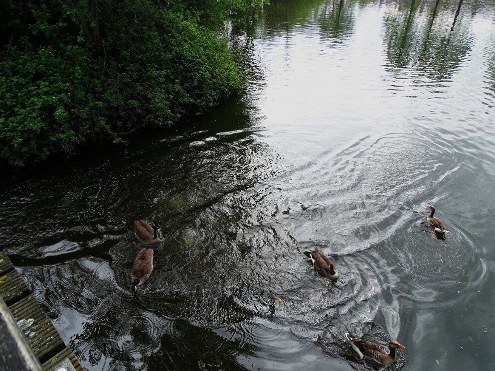 Canadese ganzen met een grauwe gans vanaf de loopbrug gezien.