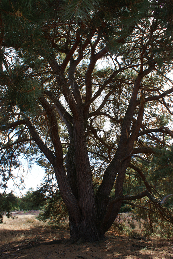 Het nest tussen de twee rechtse boomstammen in het midden.
