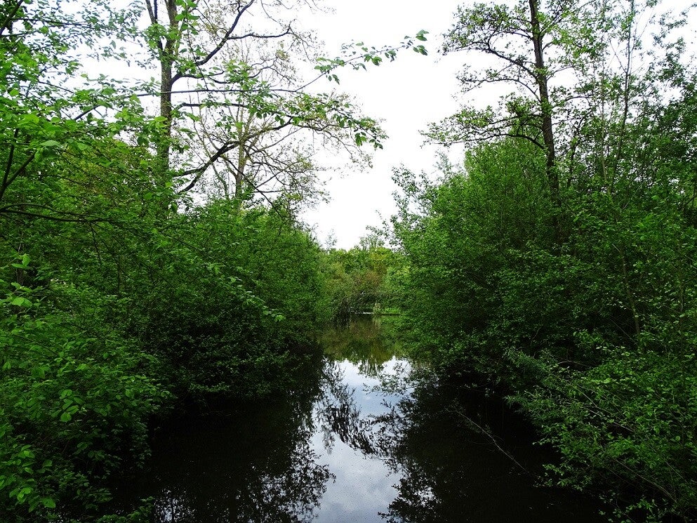 Dicht begroeide blik vanaf de fiets/loopbrug.