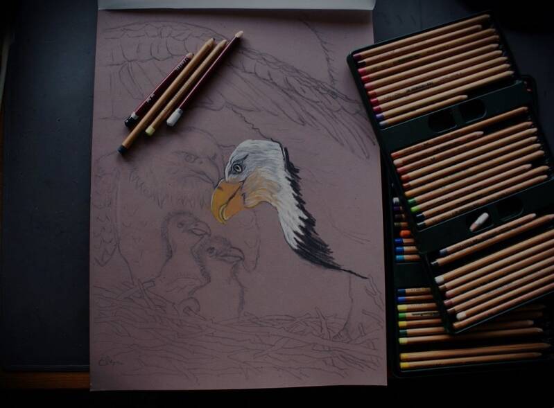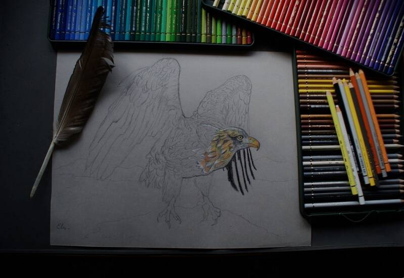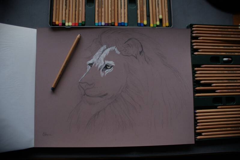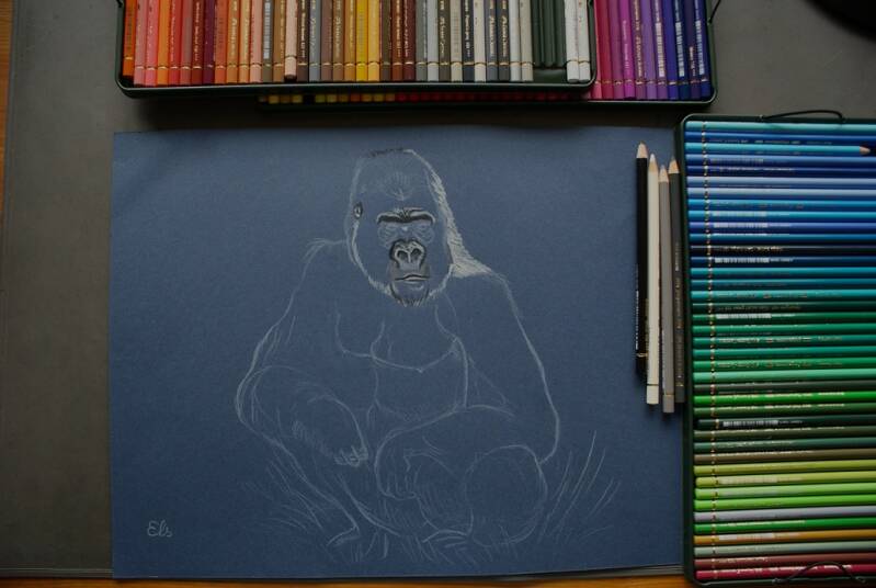 Tekening op gekleurd tekenpapier met polychromos kleurpotloden.