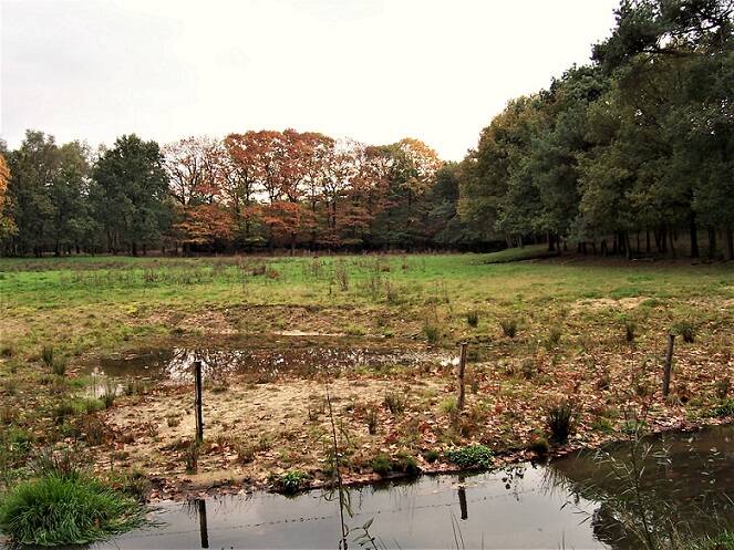 Wij zaten vanuit de toren gezien nu achter de Snelle Loop. Al die voorgaande keren zaten we er voor. Het hek was dichtgebonden. Een juist besluit. Kan ie niet meer open blijven staan. We zijn toen via de bosrand , het brugje achter de toren over de Snelle Loop overgestoken om weer op het bekende veld uit te komen in het zicht van de toren.