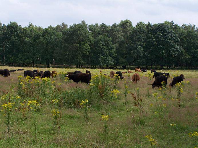 Ondertussen streken een zestal kraanvogels in het veld tussen de ruig behaarde dieren neer om al heel snel hun verdere weg in de lucht te ver-volgen.