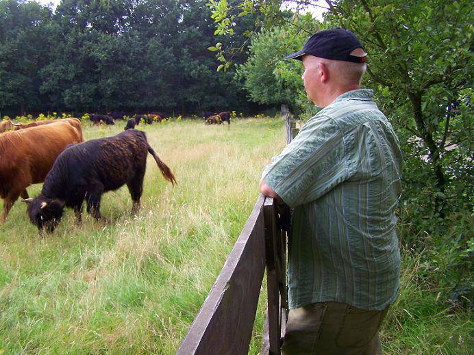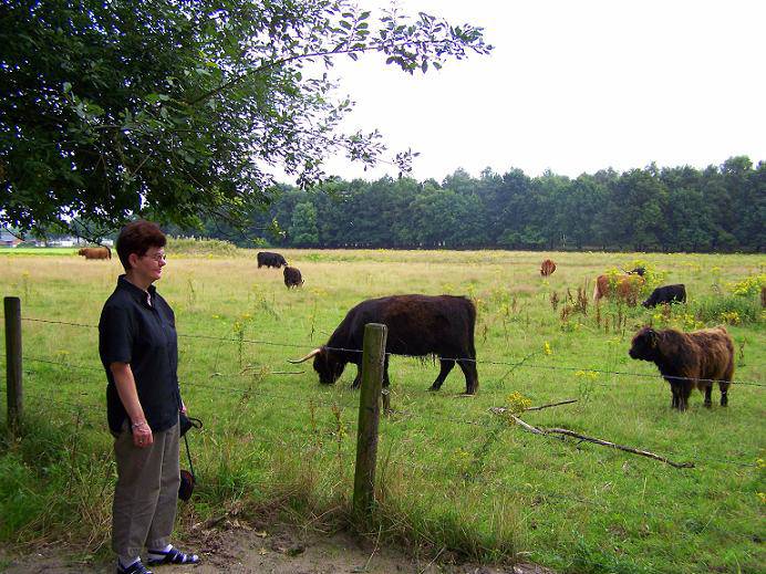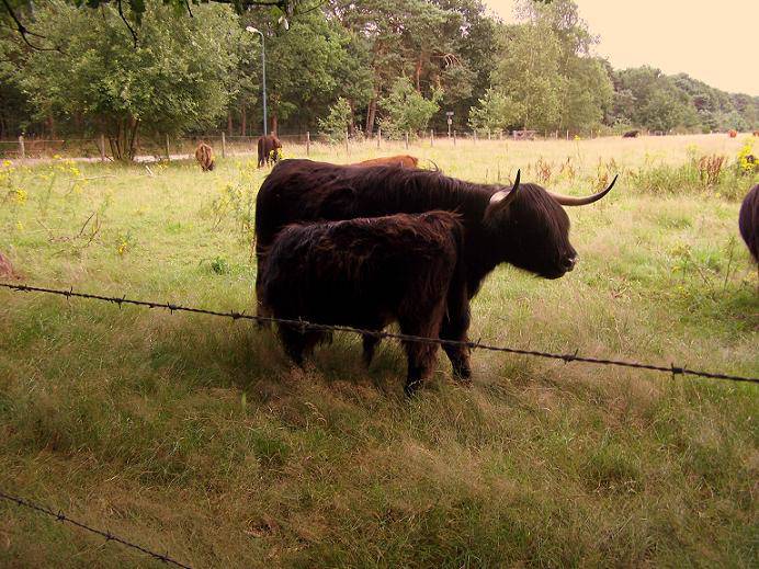 Terwijl Sjef daar naar op jacht was dacht een schitterend Schots hooglandervrouwtje: "Wat is dat voor een interessante stier! Dát moet ik toch eens van zeer nabij bekijken!" en het mooie bruine beest kwam