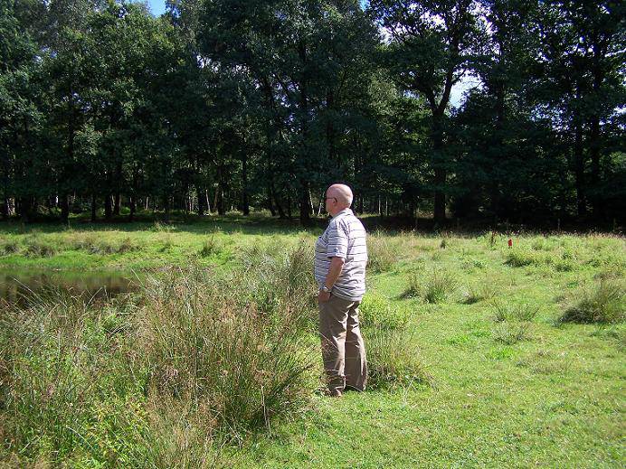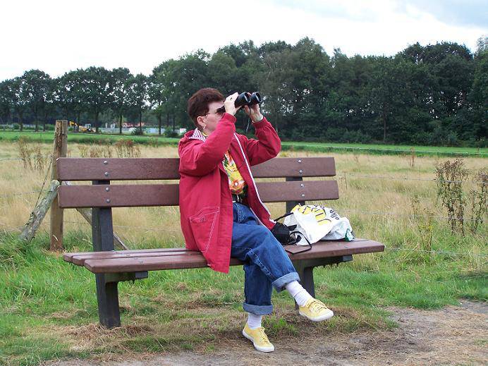 Op een gegeven moment ben ik weer op mijn gemak terug gewandeld. Vanuit de verte zag ik Sjef zitten aan het nieuwe groene zitelement op de spottersplaats. Ik kwam naderbij. Ik dook de berm van de Hemels-bleekweg in, rakelings langs de sloot af. Ik richtte het fototoestel op Sjef stiekem tussen het struikgewas door. Ik wilde namelijk vastleggen, hoe hij zonder veren, steunend met zijn gezicht in zijn handen, een slaperig oogje dicht deed! Sterker nog: twee dichte slaperi