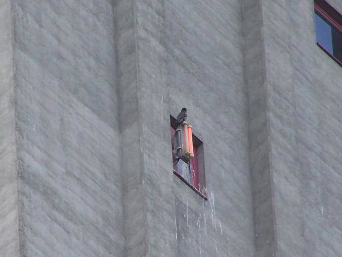 De naam slechtvalk is mij niet ontschoten. Eentje zat bij de nestkast bovenop de Toren en eentje zat in het venster van een de torenraam-pjes. Valkje was niet weg te branden, omdat het in de schaduw zat.