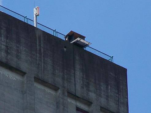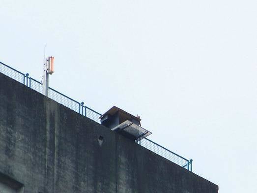 Opeens geroep van valken. Eentje zat al op de bovenste stang van de grote antenne. Een valk komend vanaf het veld vandaan streek op de dakrand neer achter de buitencam.