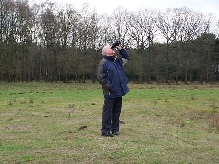 Gerrit112 die geheel de dag in de lommerrrijke schaduw achter de Snelle Loop aan de bosrand had gezeten, kwam ons tegemoet gelopen. Hij wist ons te vertellen dat de valken ontzettend veel vliegbewegingen hadden laten zien vanmorgen. Gerrit keerde voldaan huiswaarts.