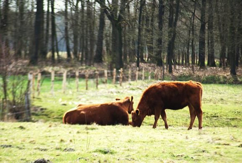 Achter de Toren op het uitgestrekte veld stonden enkele Angus Aberdeen runderen te grazen.