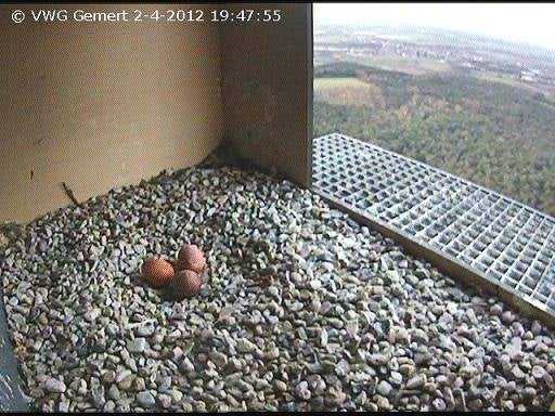 Het valkenpaar bij de drie eitjes.