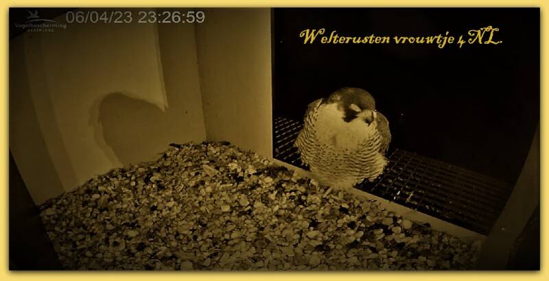 Vrouwtje 4Nl is enige tijd uit de nestkast geweest. Ze heeft zich nat laten