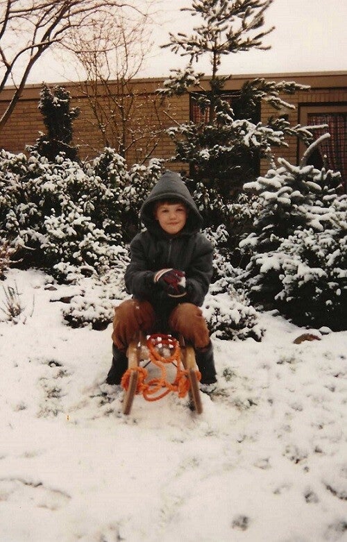 7-1-1987 - Marcel in de besneeuwde achtertuin van onze voorheen tweede koopwoning.